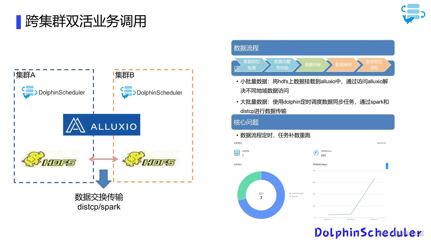 另一方面,我们有一些业务需要跨集群去调用,例如A集群数据到位后B集群要启动统计任务等,我们选择 Apache DolphinScheduler作为调度和控制,来解决这两个问题。