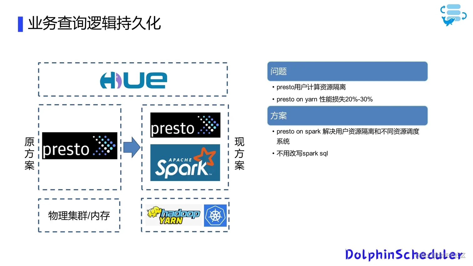 另一个问题是Presto原生没有租户间的资源隔离问题。我们也是对比了几个方案之后,最后结合实际情况选择了Presto on Spark方案。