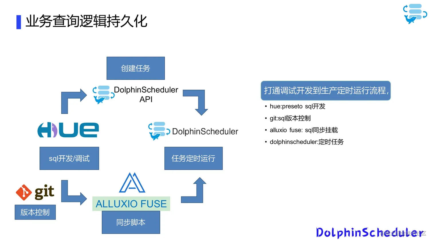 我们将本地文件挂载到Alluxio fuse上,作为SQL的同步挂载,最后我们使用Hue,通过DolphinScheduler的API创建任务和定时任务,实现从SQL开发到定时运行的流程控制。