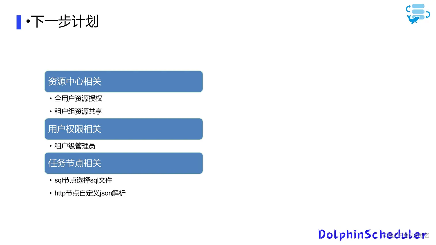 最后是我们的任务节点相关的计划,现在已在进行之中:一方面是完成SQL节点的优化,让用户能够选择一个资源中心的SQL文件,而不需要手动复制SQL;另一方面是HTTP节点对返回的json自定义解析提取字段判断,对复杂返回值进行更为友好的处理。