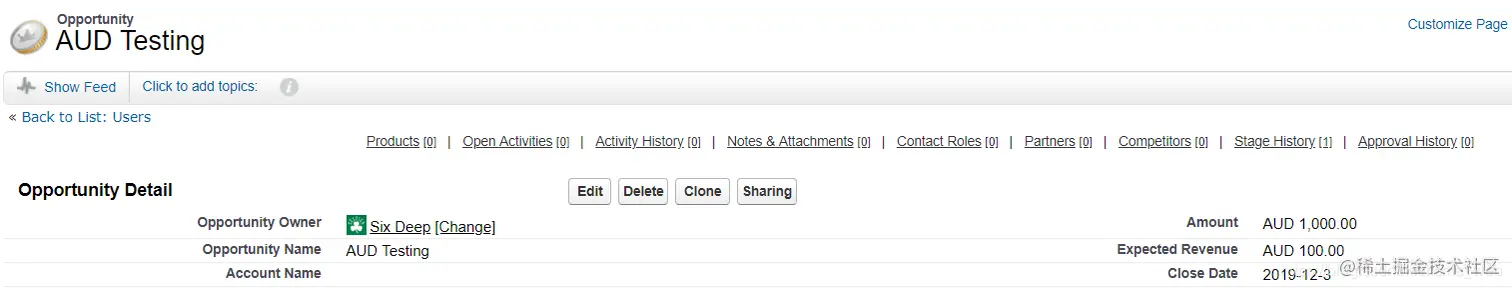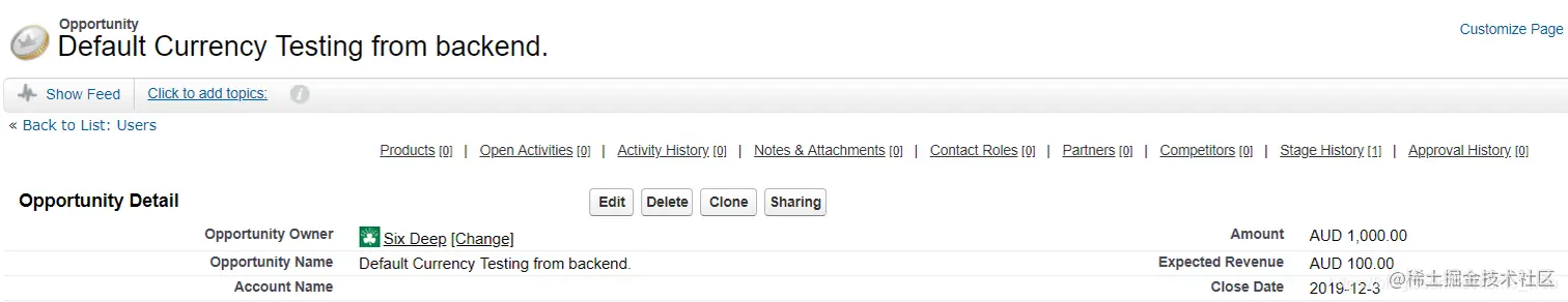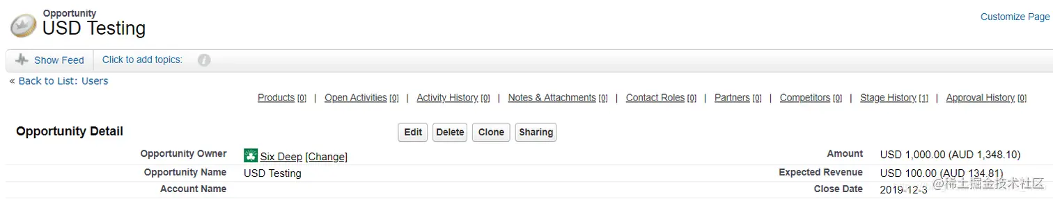 假如User的Currency为AUD,当创建Opponenty时,Opportunity Currency会被赋默认值AUD,最终展示如下: