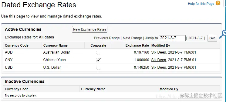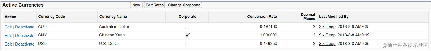 我们计划通过切换User上的Currency字段,来观察记录在用户界面,SOQL及报表里面的影响:
