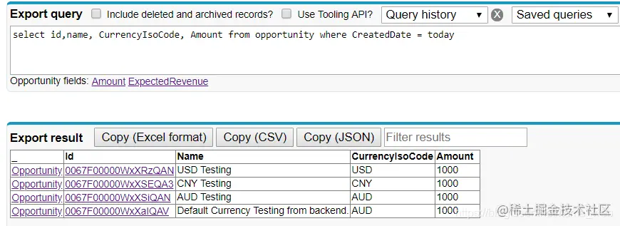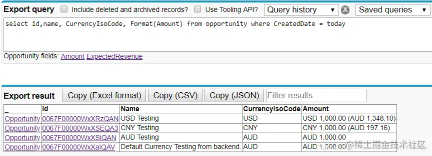 - 界面和SOQL format显示的结果相同,User和单子配置一致,则显示单种货币类型,不一致则有限显示单子类型,用户类型紧随其后;报表显示更加精炼,单项显示单子货币类型及输入值,汇总显示User货币类型及汇率转化后的实际值;