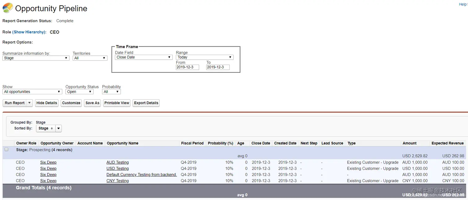 我们发现报表累计汇总后的金额以User上的Currency及对应货币转化率下的实际值作为显示结果,而每项金额以实际记录上的值和货币类型显示。