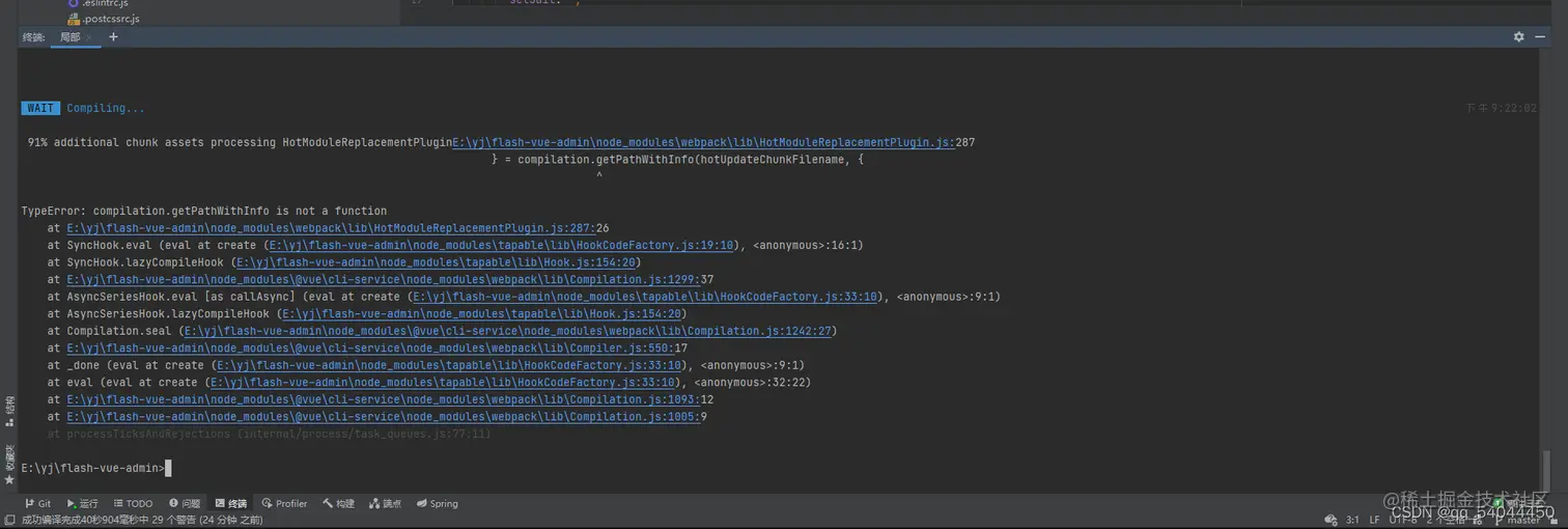 最近在运行前端的时候出现一个错误,只要改动vue和js文件,一保存就会退出运行,出现TypeError:compilation.getPathWithInfo is not a function的错误,并且重新clone项目也还是一样。