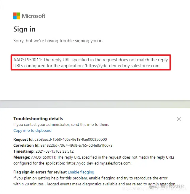 Q2、单点登录时,报错如下:AADSTS50011: The reply URL specified in the request does not match the reply URLs configured for the application: 'ydc-dev-ed.my.salesforce.com'.