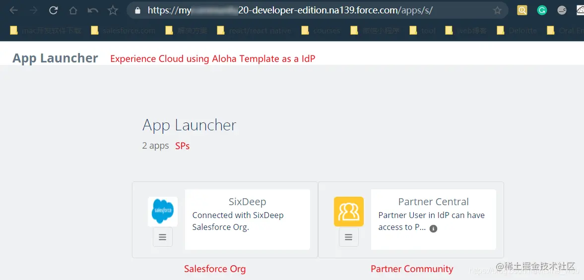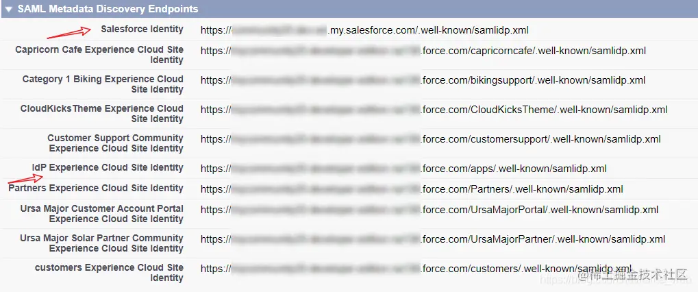 - 在SF间做SSO(SF Org间 / Experience Cloud间),其中Identity Provider信息是公用的,SSO Settings与Connected App需要相应创建;以前言图例说明,SPs在同一个Org,登Salesforce与登Experience Cloud是两个不同的domain,所以在SP中创建SSO Settings时,需要分别使用IdP中的两套xml信息: