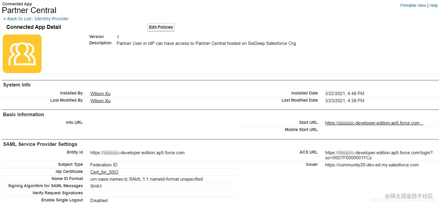 #8. IdP:为SP创建相应的Connected App,其中Entity ID, Issuer是#6中复制的,Start URL与ACR填上#6中对应位置的Login URL;