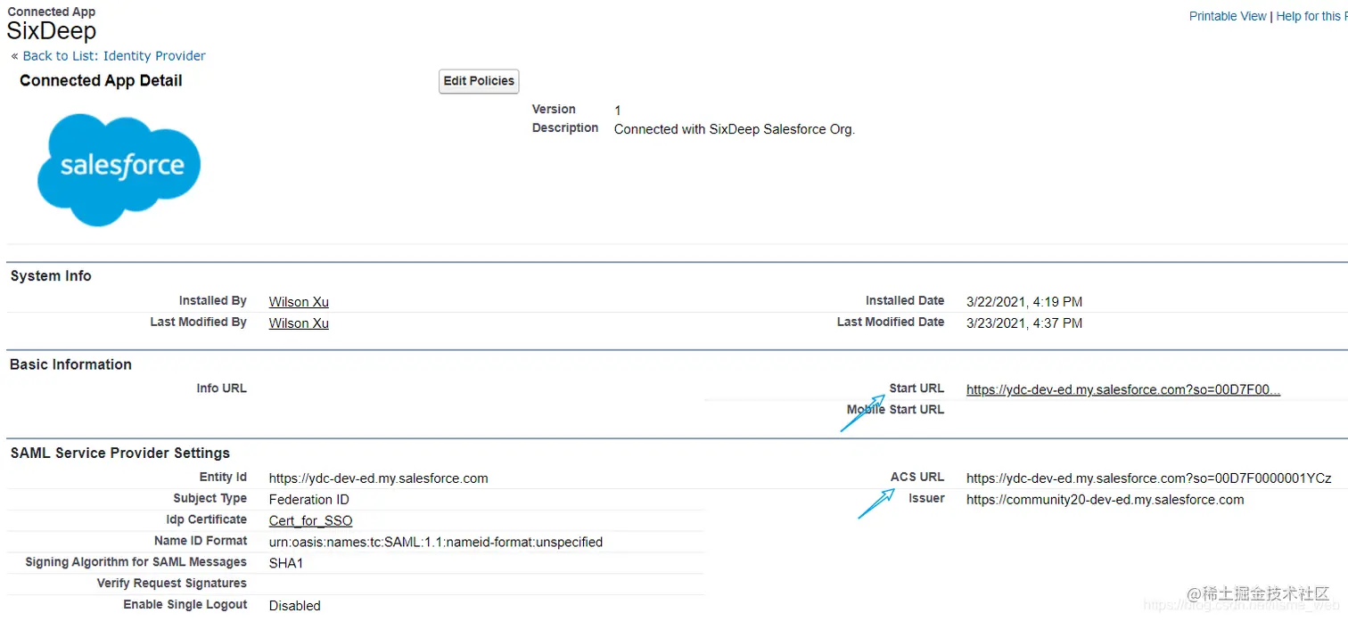 创建后的SP中的SSO Settings与IdP中的Connected App对应分别如下: