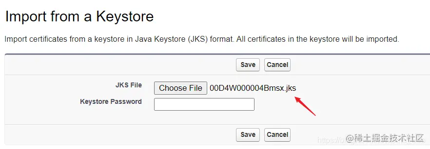 跨Org交换证书在SF的Certificate and Key Management中有个叫keystore的概念,导出导入需要统一的密码,以下是导入示例:
