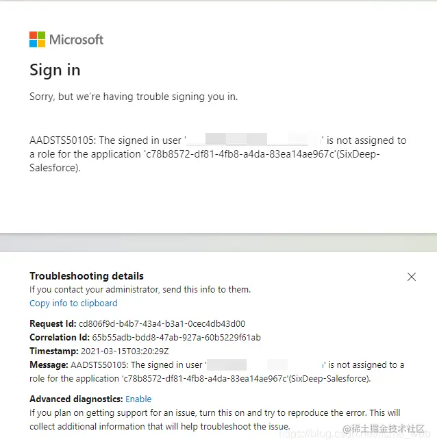 报错如下:AADSTS50105: The signed in user {email address} is not assigned to a role for the application '{tanent id}'(SixDeep-Salesforce).