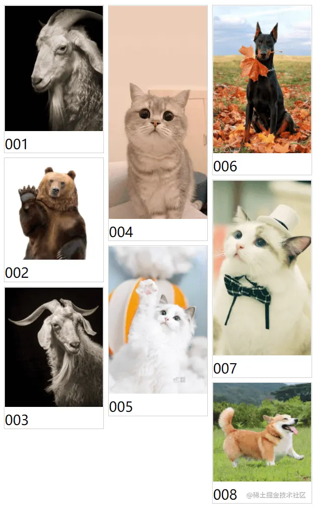 不同于上面两个 css 实现的瀑布流,JS 实现的图片排序顺序是先水平方向,然后才是垂直方向