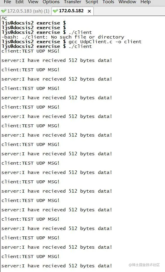 - 自己主机跟自己通信不是很爽,我们想跟其他主机通信怎么搞?很简单,上面client的代码的第49行的注释打开,并注释掉下面那行,在宏定义里填入自己想通信的serverip就可以了。现象如下: