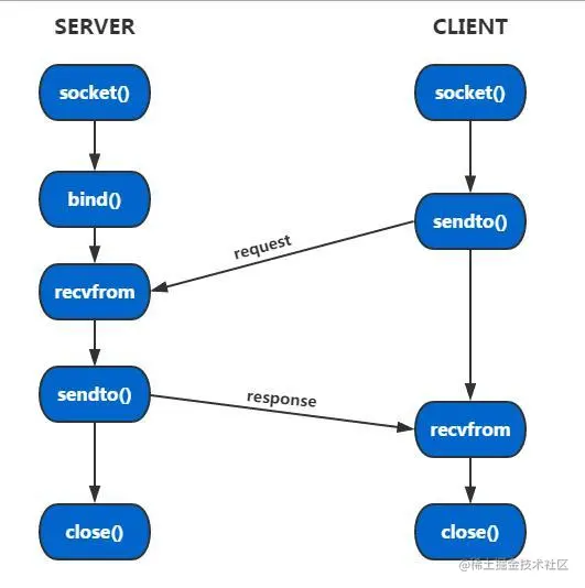 - 由以上框图可以看出,客户端要发起一次请求,仅仅需要两个步骤(socket和sendto),而服务器端也仅仅需要三个步骤即可接收到来自客户端的消息(socket、bind、recvfrom)。
