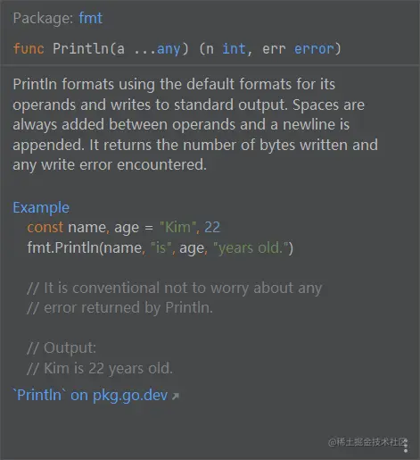 将鼠标悬浮在Println方法上可以显示一个链接,可以看整个包的在线文档