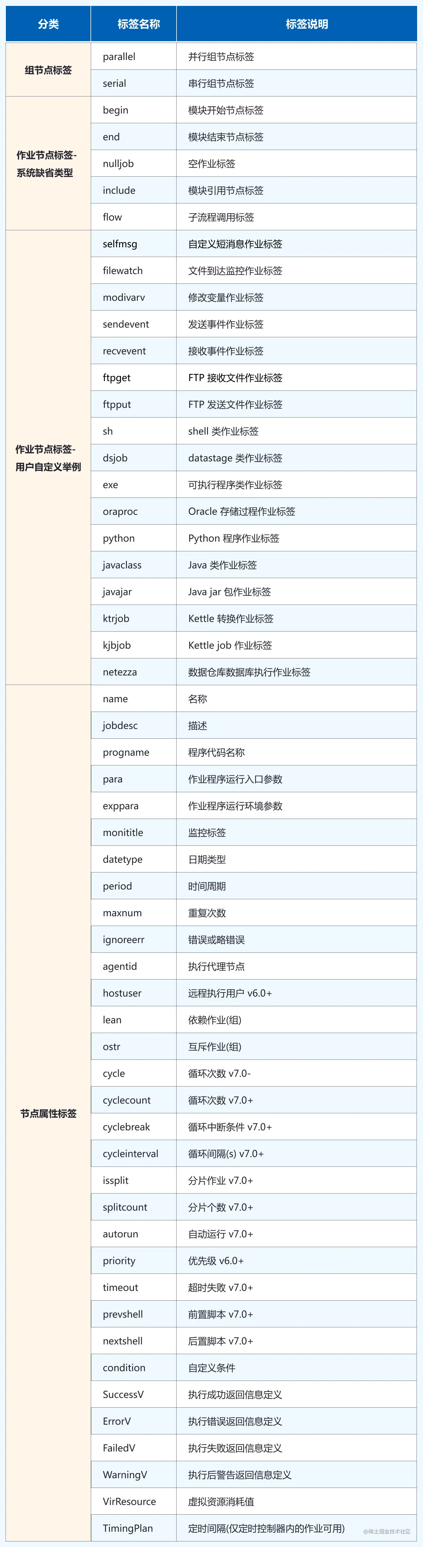 自定义作业指 ETL 中用户开发的各种作业,比如:shell、datastage 类作业等。对此类作业标签关键字是由用户自定义确定。比如,对于 shell 脚本作业,我们既可以用’sh’表示,也可以用’shell’来表示。 在实际应用中,自定义作业类型标签是通过管理平台定义的,TASKCTL 为了方便用户,也预设了一些常用自定义作业,如:ftpget、filewatch、selfmsg 等作业。