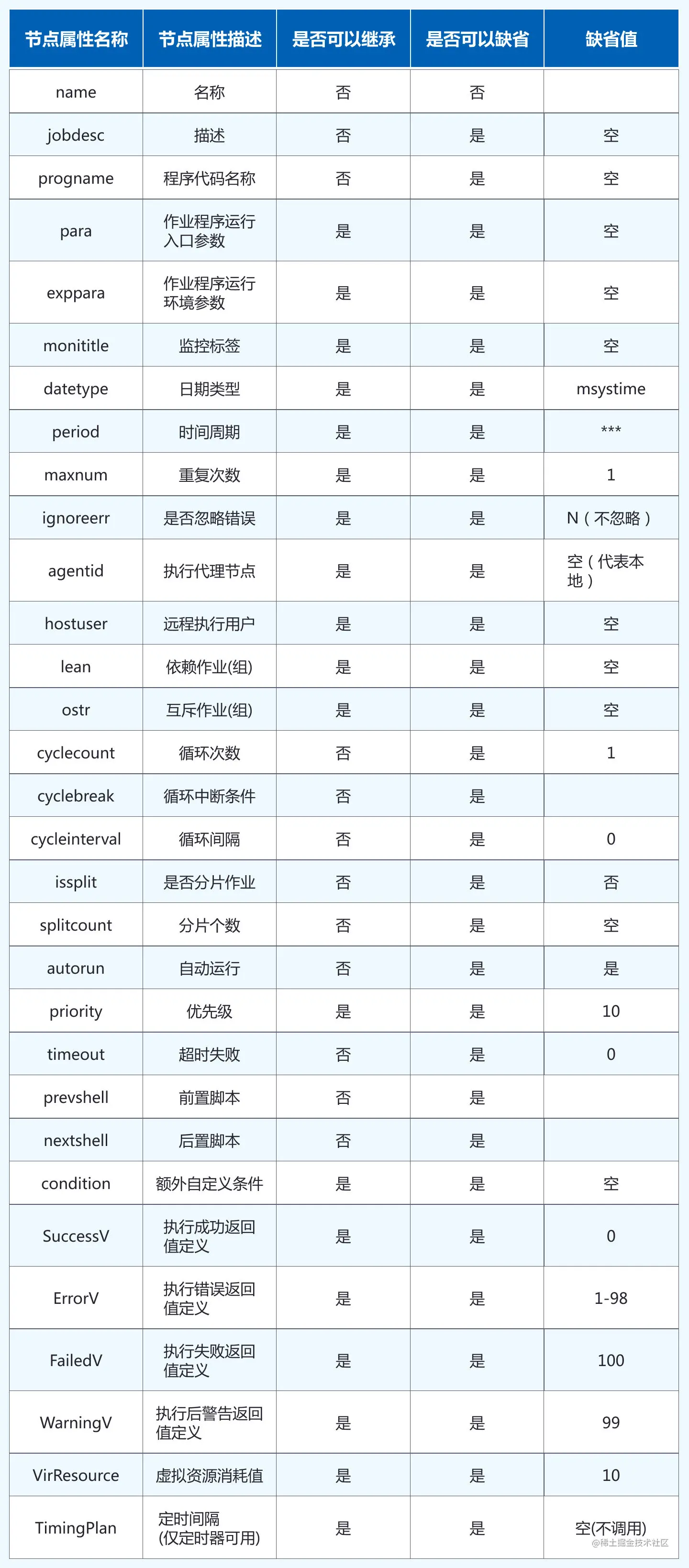 一个流程作业或组节点属性较多,但并不是所有属性都具有继承与缺省特征, 比如:节点 name 属性,该属性即不能继承也无缺省,用户必须显示定义;又比如