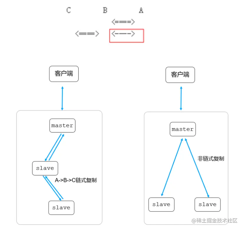 **链式复制的概念:**假设节点A(primary)、B节点(secondary)、C节点(secondary),如果B节点从A节点同步数据,C节点从B节点同步数据,这样A->B->C之间就形成了一个链式的同步结构,如下图所示: