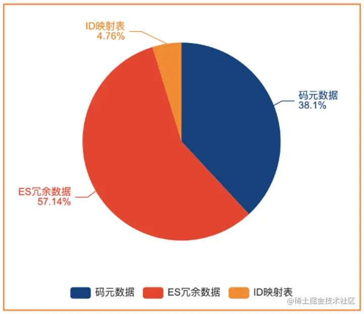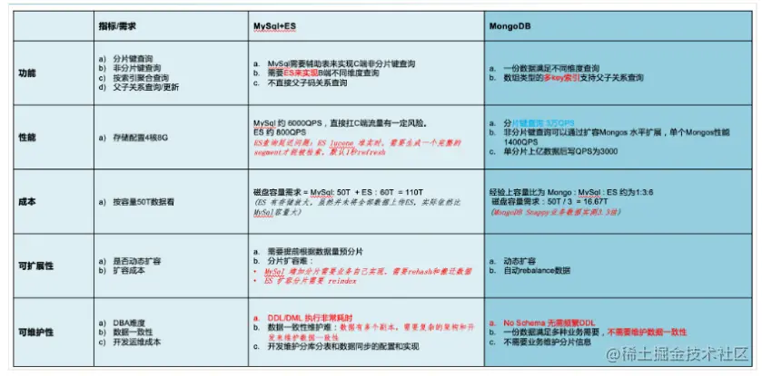 一方面,在MySQL+ES的方案下,为了满足需要我们需要将冗余一份ES数据和MySQL的冗余表。其中码的核心数据存储在MySQL中,其磁盘总量仅占总的38.1%。前面说过 MongoDB的方案是不需要冗余存储的,因此使用MongoDB可以减少这61.9%的总数据容量。