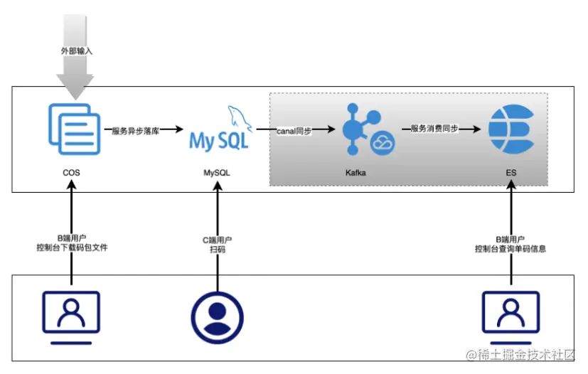 MySQL + ES 的常见架构是写操作直接作用于MySQL,然后通过 canal + Kafka 的方式将数据变更同步到ES,然后再根据不同的查询场景从MySQL或者ES查询数据。下图是在腾讯优码业务场景下可能的架构图: