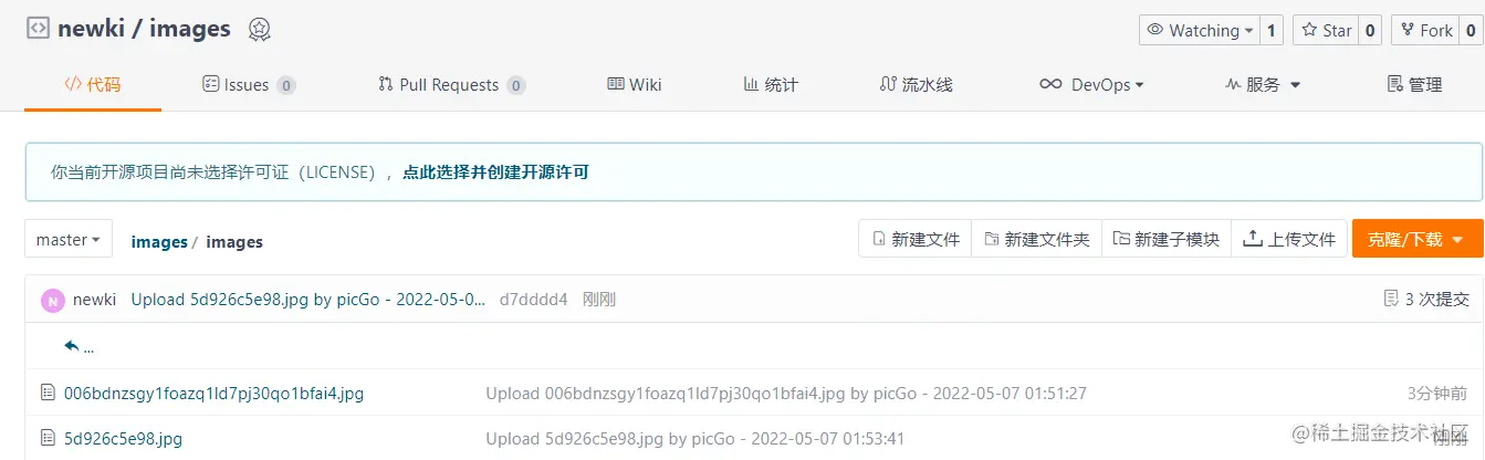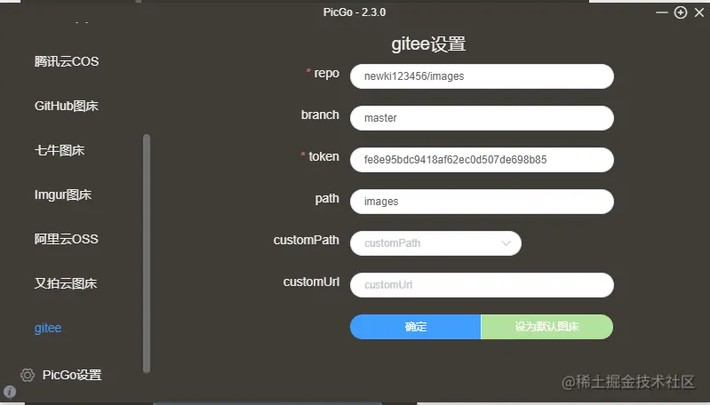 注:repo的填写规则:打开你的仓库,网址栏上面的地址如:https://gitee.com/newki123456/images。那么我们只取后面的newki123456/images作为我们的repo。token则是你创建的私人令牌,复制到那一行。path可填可不填,可以填img 可以填images都行。