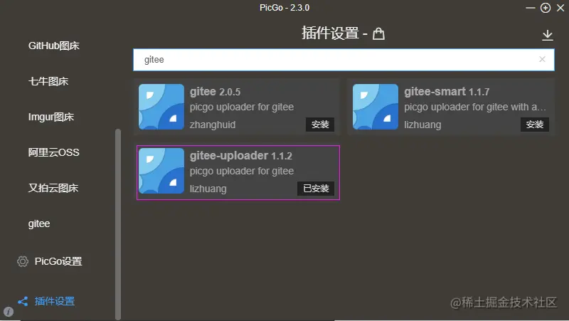 配置码云的云端配置,由于PicGo默认不支持码云Gitee,所以我们需要为Gitee配置插件,点击左侧的插件设置,如下安装插件: