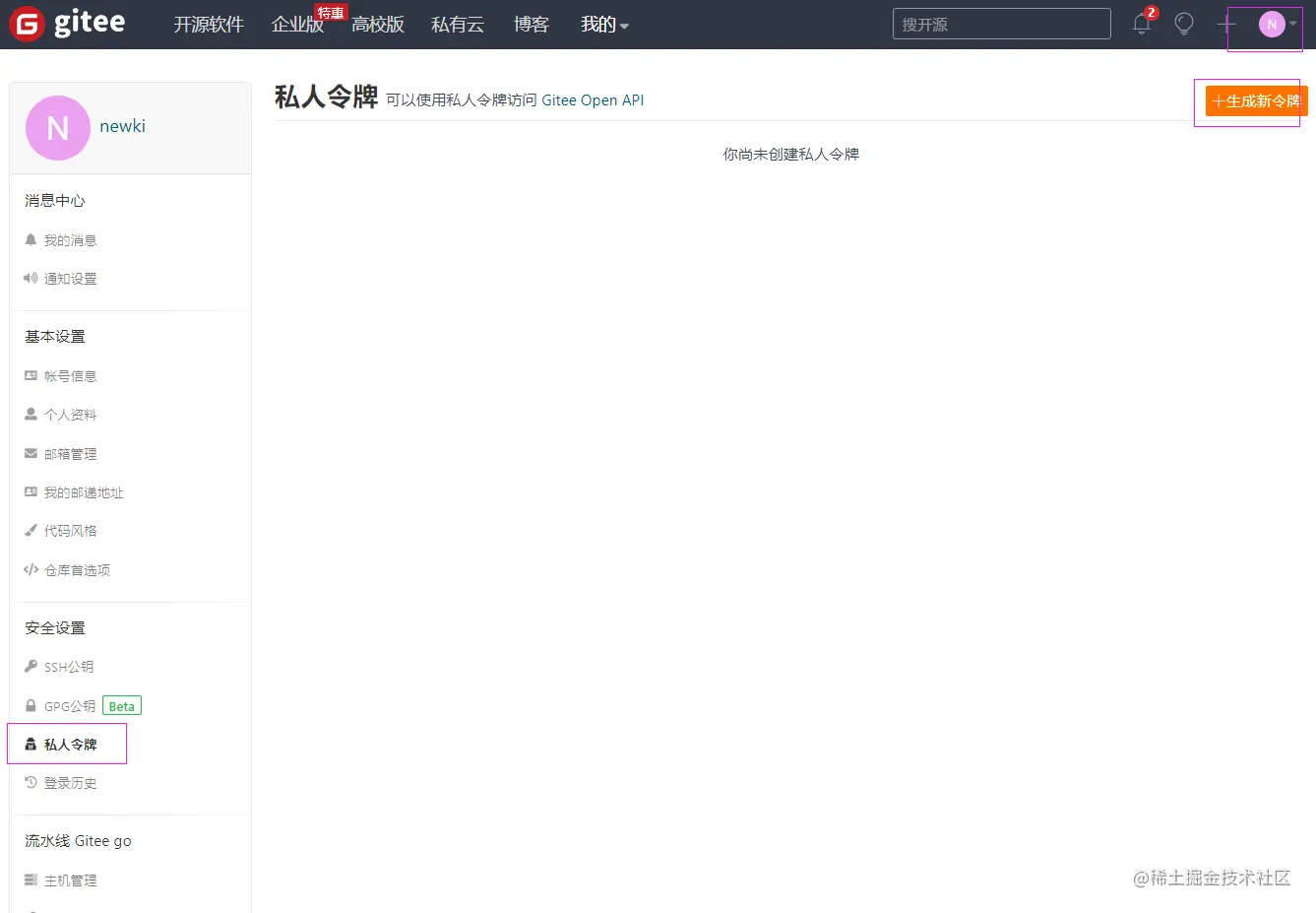 去码云创建你的私人令牌: