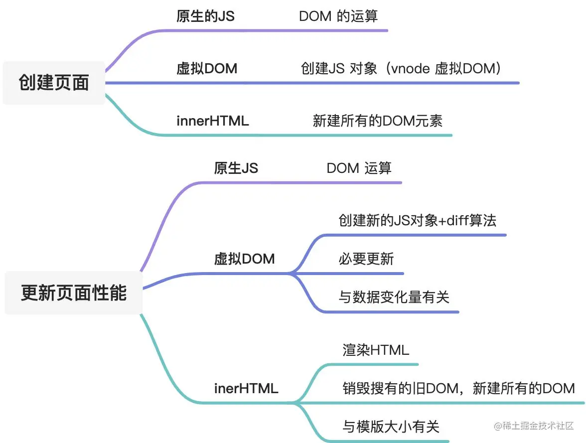innerHTML ,是通过拼接的字符串 和原生JS 相结合 ,如果模版比较大,更新的性能最差,特别是模版大,少量更新的时候