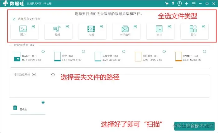 扫描:选择好丢失的文件类型(首次使用建议全部选择),还有文件丢失之前的路径位置后,即可开始“扫描”;
