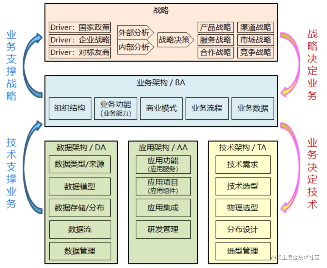 - 技术架构(TA) 定义开发,部署,运行,运维应用系统所需要的技术选型,基础组件以及相关基础设施