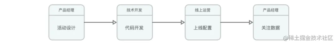 从上图可以看到,在活动上线的业务流程上,存在四个环节,每个环节都需要对应的角色做相关的工作,因此一个活动上线的整体成本是包含四环节成本的总和,而在实际新活动上线的过程总,技术开发和线上运营这两个环节的成本又是占比重最大的。上面已经分析过技术变更产生的原因,但对于那些未发生变更的新活动开发案例,工时就符合预期吗?当然也不是,技术开发是基于活动中台能力制定方案和进行开发的,因此中台能力的设计是否符合新活动的上线流程以及产品的活动设计思路,会对技术方案和开发效率造成很大的影响,我们理想中的情况应该是,对于一个新活动,其上线业务流程应该如下