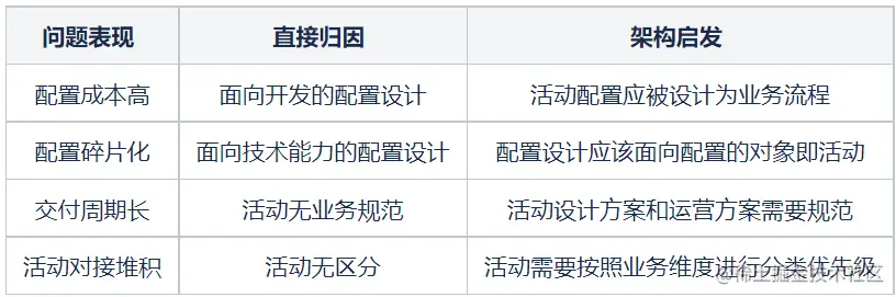 - 活动需求堆积在活动中台,中台成为研发链路上的瓶颈,很多活动都有自身的时效性和活动窗口期,由于堆积导致活动错过最佳时机上线运行,效果大打折扣,甚至有些活动由于迟迟排不上期而不了了之