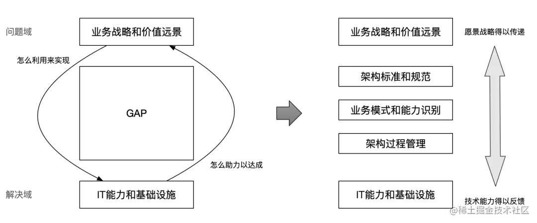 如上图所示,在企业的战略和远景的驱使之下,在技术团队可用的 IT 方案和基础设施之间,是存在 GAP 的,这个 GAP 的作用是将业务目标和期望导向落地解决方案,同时使得落地解决方案能更好助力业务目标和期望的达成。填补这块空缺的,就是企业架构,而进行业务分析和业务架构设计是落地企业架构的首要任务。