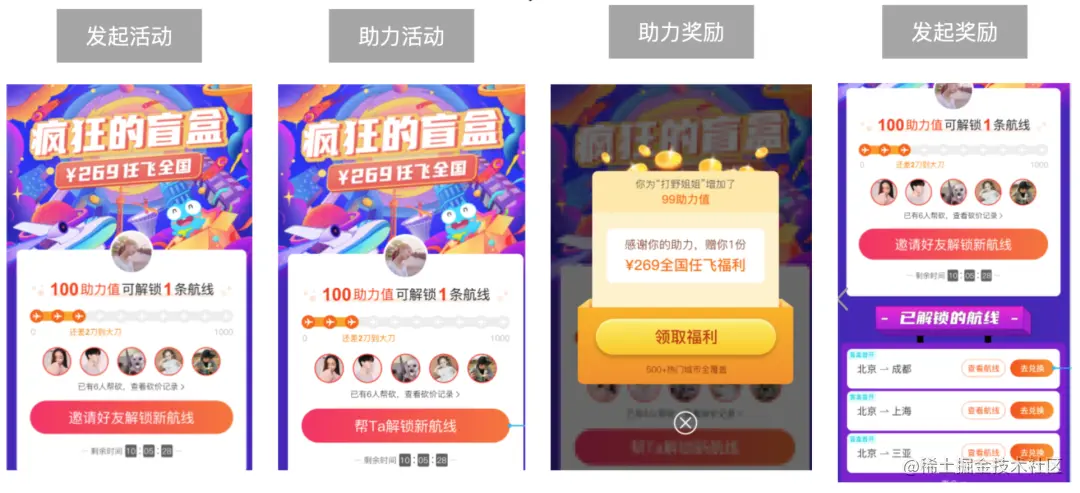 - 用户购买机票盲盒商品,成为活动的发起者,发起者可以进行发起活动来邀请好友帮忙助力来解锁盲盒可以兑换的航线