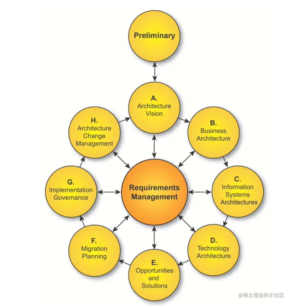 同时业务架构也是需要随着业务的发展和战略目标的变化而不断改进的,在 TOGAF 给出了架构开发方法(ADM)中,给出了完整的架构开发的周期过程,在这里也提供给大家作为参考。