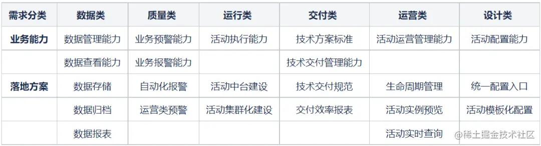基于上面整理出来的业务流程和各利益相关方的关注点,我们可以把业务需求进行分类,并针对每一类业务需求设计对应的业务能力。这个阶段的产出如下表: