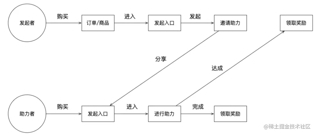 如果我们抽象一下,类似盲盒活动的这类助力分享裂变类的活动流程可以如下图: