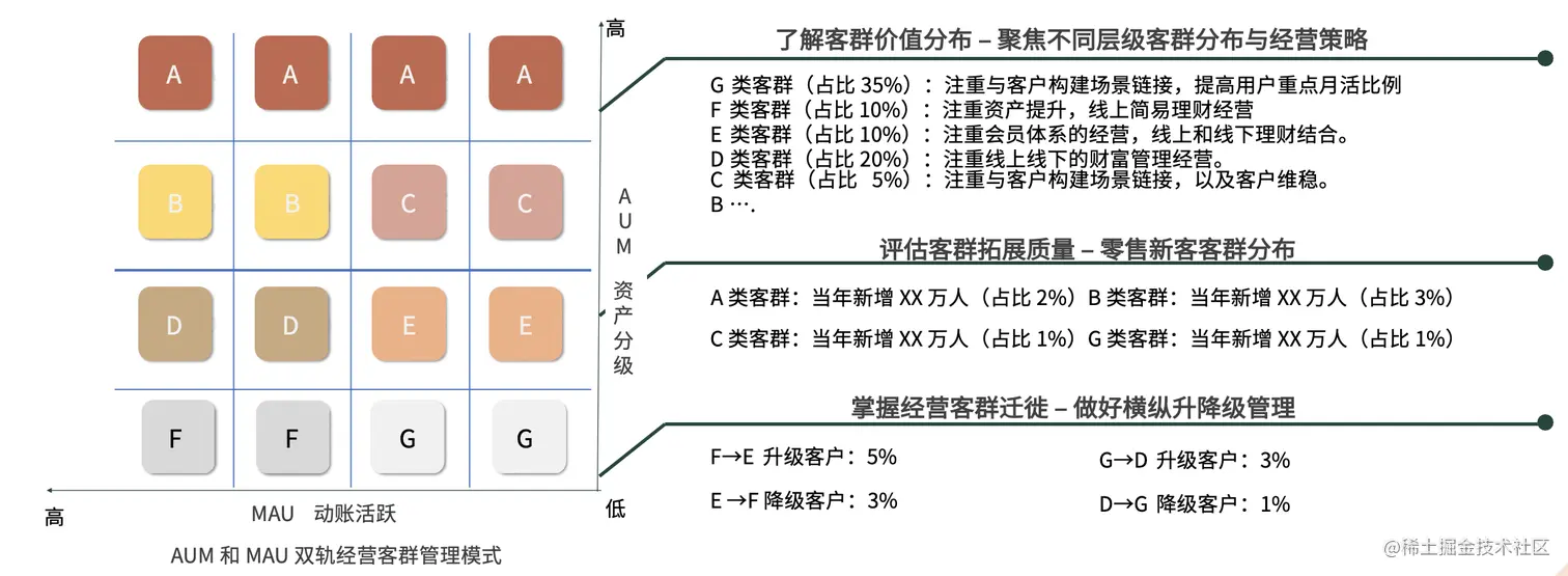 随着客户线上行为的日趋增长,银行的经营模式正在从“单轨 AUM 经营模式”走向“AUM 和 MAU 双轨经营模式”,基于 AUM 和 MAU 双轨经营逻辑,建立十六宫格动态分类标准,了解客群价值分布、制定分群管理经营策略、评估客群拓展质量、掌握经营客群迁移情况。