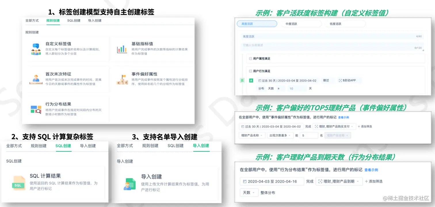 其二,支持规则化配置。平台提供创建首次末次特征、事件偏好属性、行为分布结果等特征标签的可视化模板,业务适用方仅需按照相关标签的配置逻辑,选择相应模板进行简单操作即可配置落地,用户标签创建灵活便捷。