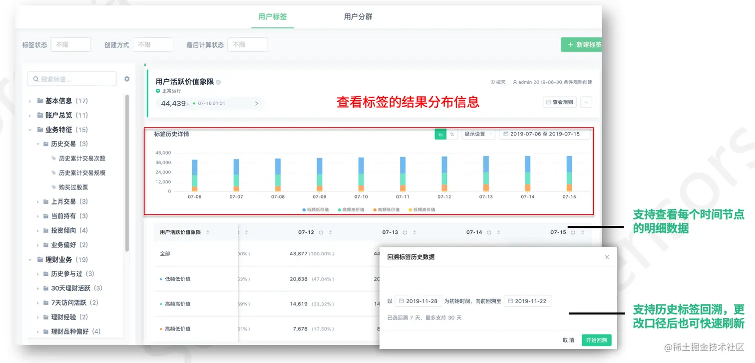 其一,支持可视化展示。提供标签的可视化分层管理以及支持各类图表展示标签的用户数据情况,实现业务对标签、客群数据现状的即时洞察;同时提供使用便捷的可视化交互界面操作功能,通过规则圈选配置,即可完成标签体系生产建设和管理。