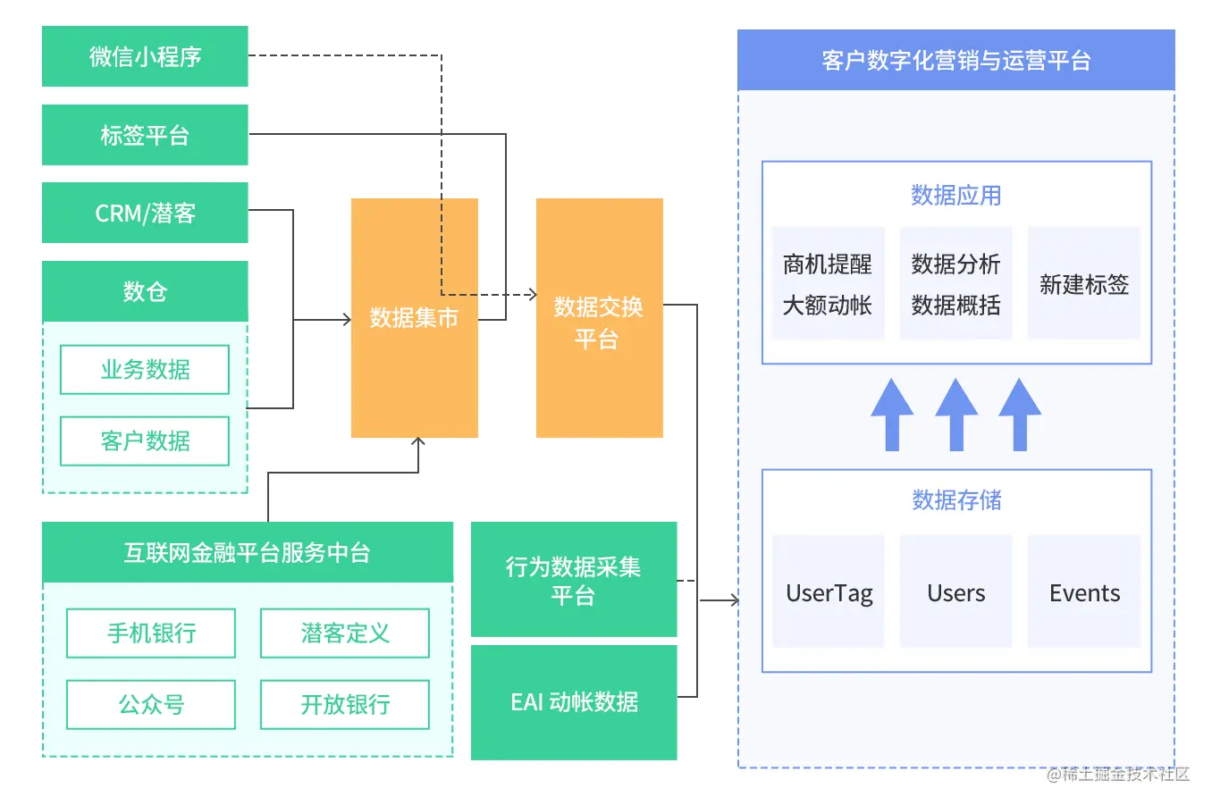 (2)对接整合多源数据,实现客户数据统一管理。在打通的用户明确了唯一 ID 后,我们还以此对接了行内的数据仓库,数据集市,标签平台,渠道整合平台、实时大额动账数据等业务数据以及手机银行埋点数据和微信小程序的埋点数据,在此过程中,我们梳理了近 30 张集市层数据表、近 600 张数仓中间表,制定了数据 ETL 方案,实现多源数据整合入库。