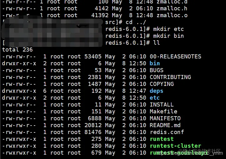 2、编译完成后,我们会看到redis-6.0.1中会有对应的src、conf等文件夹