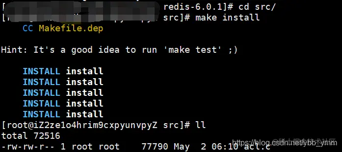 3、编译成功后,进入到src文件夹,执行make install进行Redis安装。