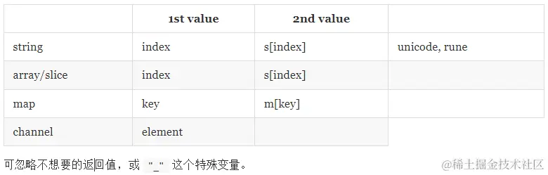 Golang range类似迭代器操作,返回 (索引, 值) 或 (键, 值)。