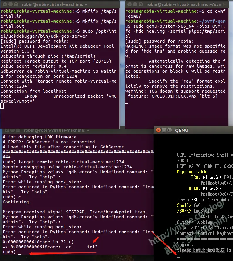 准确地说,应该是在Ubuntu 16.04下,使用Qemu模拟UEFI启动环境,同时配合Intel UDK Debugger tool和gdb建立的X64调试环境。