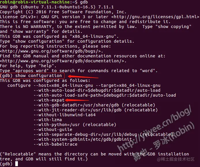第2步有点奇怪,我到现在也有点糊涂。参照用户手册,重编译gdb的目的是使gdb包含解析Expat XML的分析库。而我机器上的gdb中,查看一下配置: