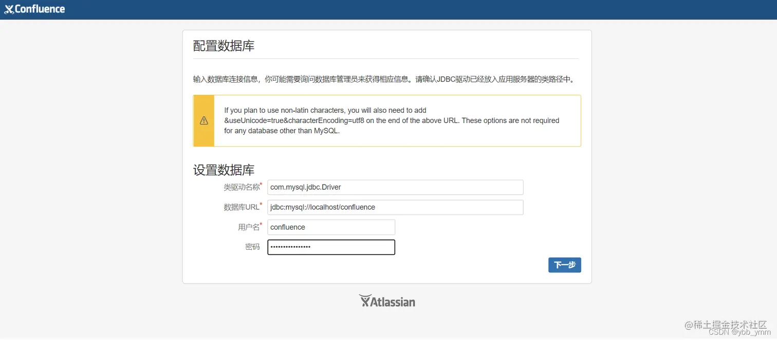 下面在首次连接mysql的时候(使用上面MariaDB里面授权的信息连接,即用户名:confluence,密码:confluencepasswd),可能有点慢,耐心等待~(此处的登录用户名密码可以设定自己的用户名密码)