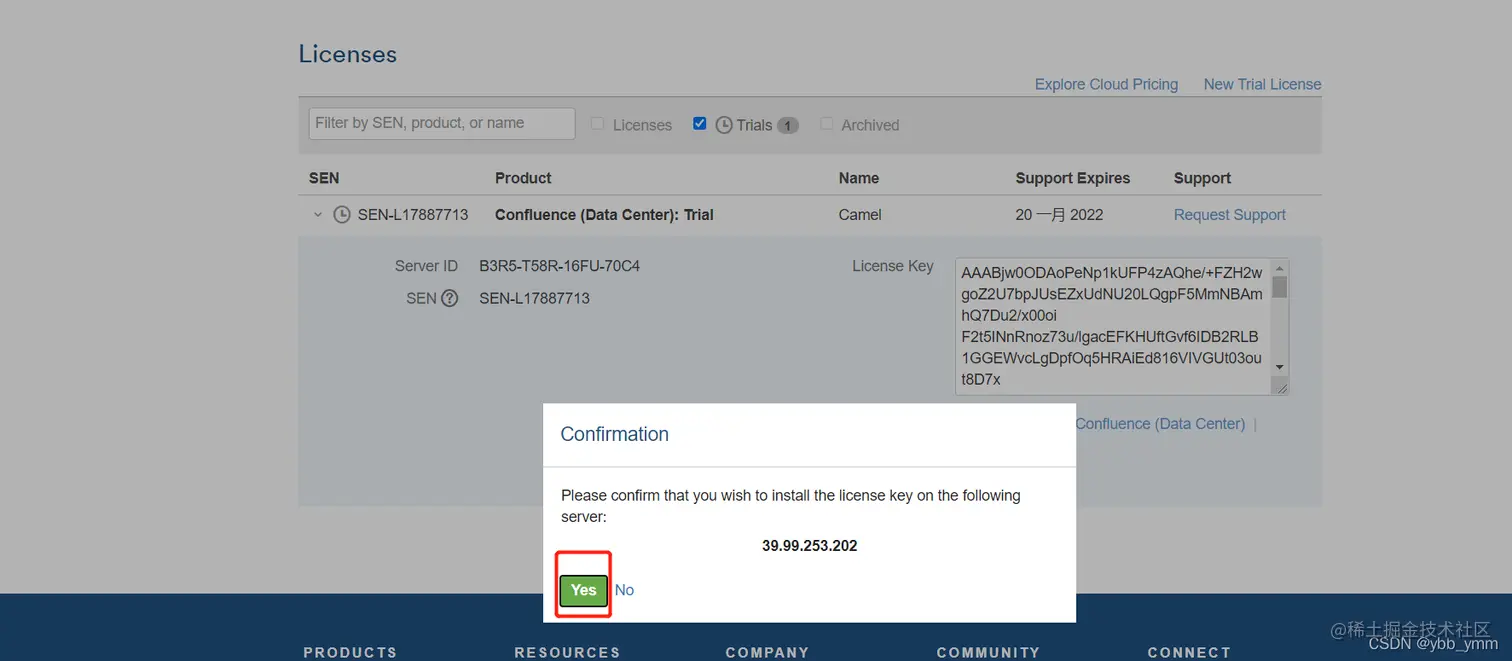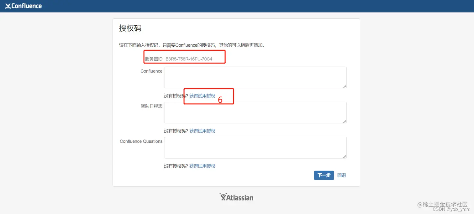 如上,右边可以看到这个confluence的license key(把这些key手动粘贴到上面confluence安装中"授权码"的"服务器ID"下面的空白框里即可)