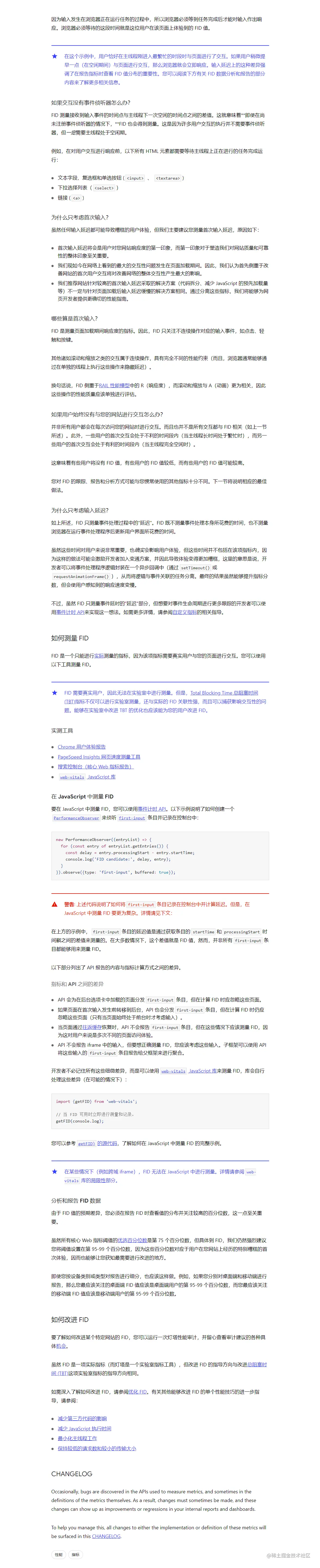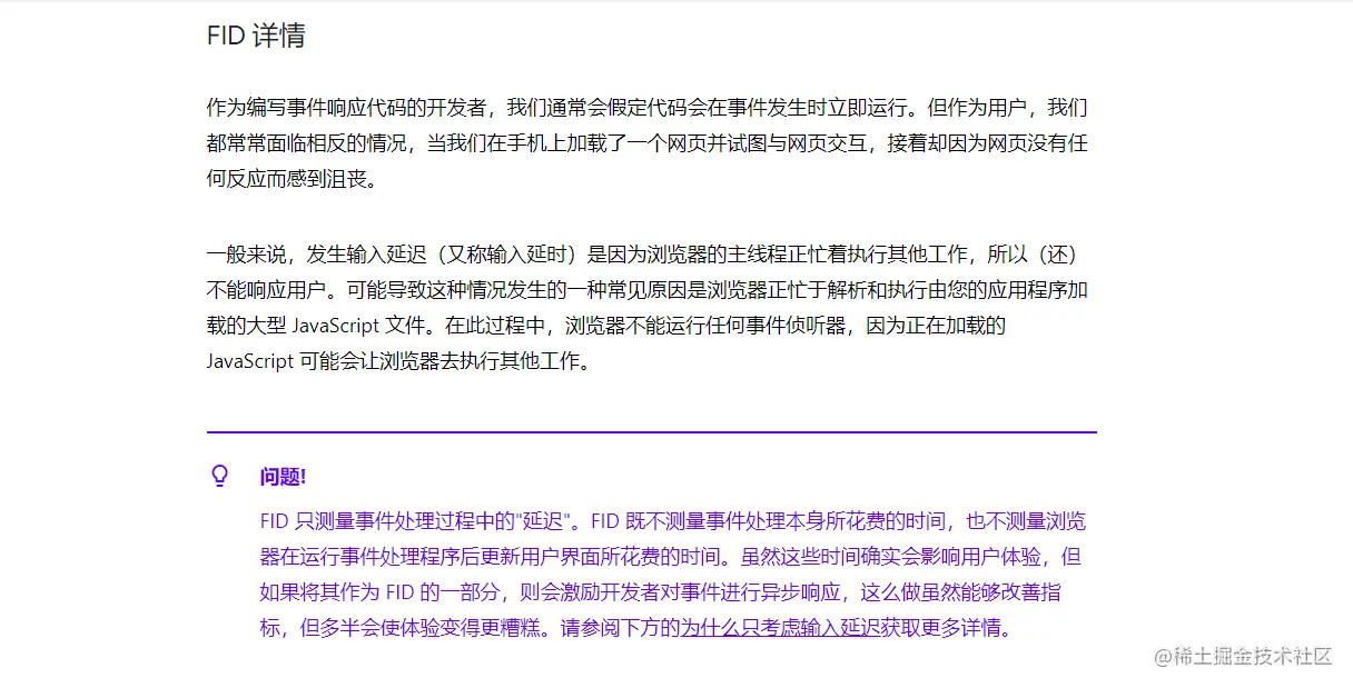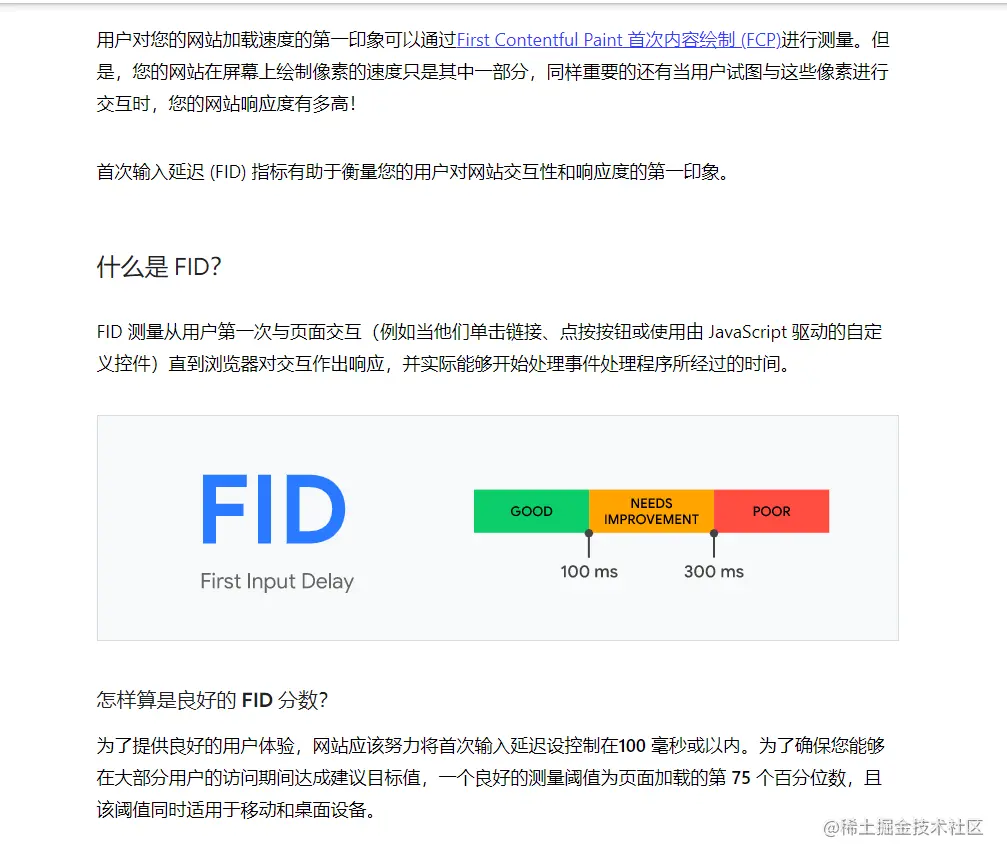 7.FID 首次输入延迟 (FID) 是测量加载响应度的一个以用户为中心的重要指标 因为该项指标将用户尝试与无响应页面进行交互时的体验进行了量化,低 FID 有助于让用户确信页面是有效的 首次输入延迟 (FID) 指标有助于衡量您的用户对网站交互性和响应度的第一印象 FID 测量从用户第一次与页面交互(例如当他们单击链接、点按按钮或使用由 JavaScript 驱动的自定义控件)直到浏览器对交互作出响应,并实际能够开始处理事件处理程序所经过的时间