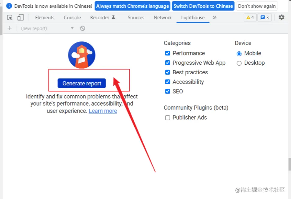 - 2.找到Lighthouse-点击 generate report,它会对页面进行相关性能的检查,最终生成报告